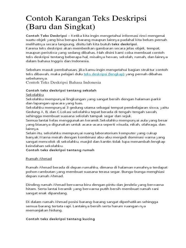 Mengandung kata keterangan untuk memberikan informasi tambahan mengenai objek. Contoh teks deskripsi tentang rumah. Rumahku adalah rumah mungil di depan mushola. Aku tinggal di sebuah rumah yang terletak di desa gang pribadi, simpang empat. Rumah ahmad terletak di depan rumahku, yang mana di halaman rumahnya terdapat pohon mangga yang membuat suasana .